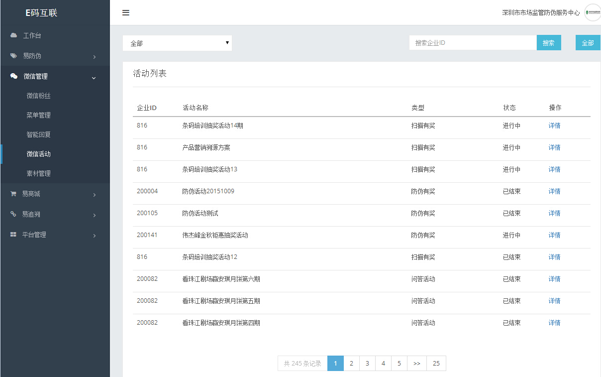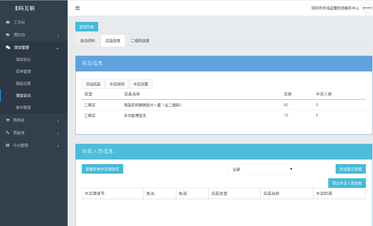 后台提供全方位的数据统计,包括扫描二维码的消费者微信ID,地址,扫描的时间,中奖信息等等,方便工作人员快速统计奖品信息,解决活动效果分析中信息处理难题;